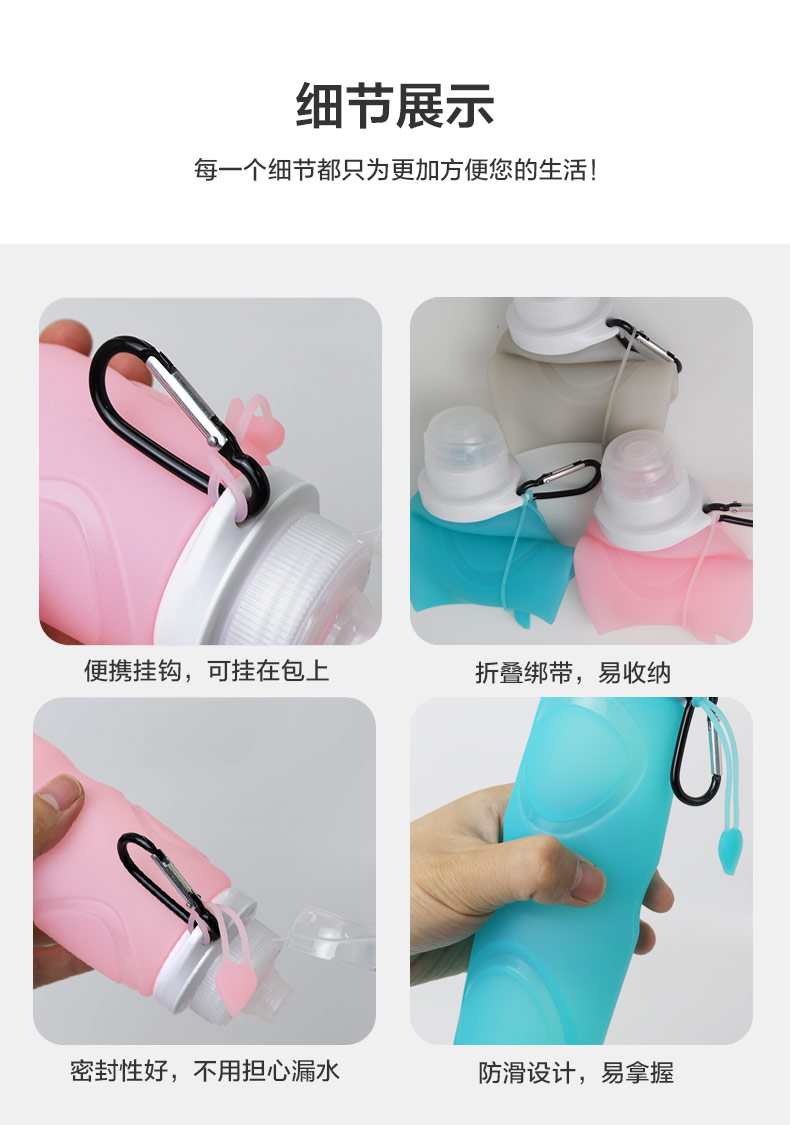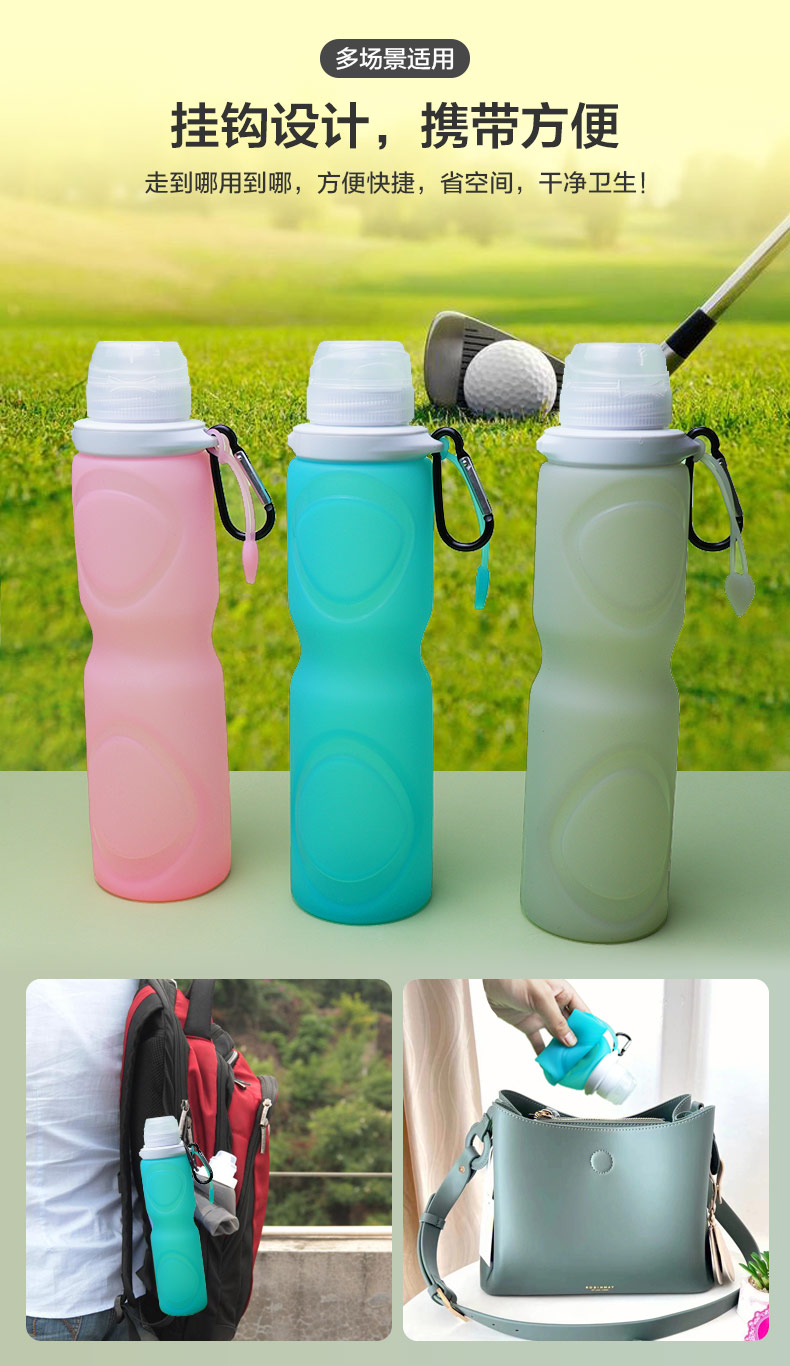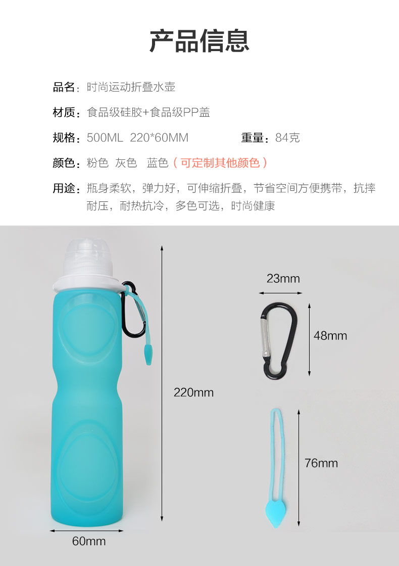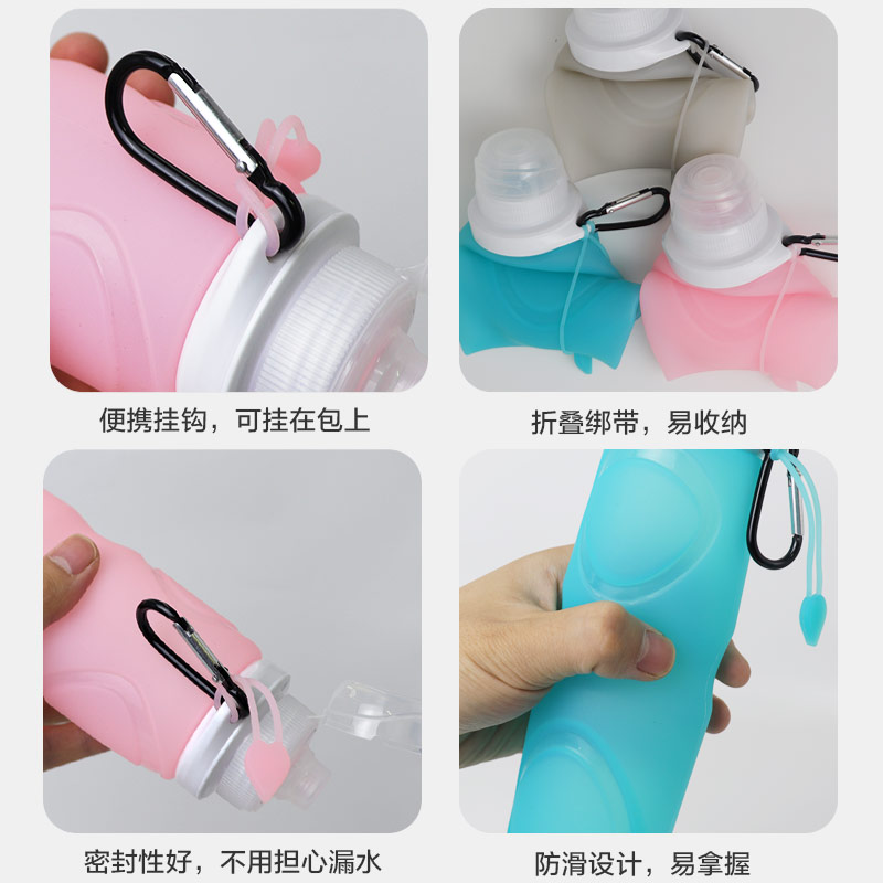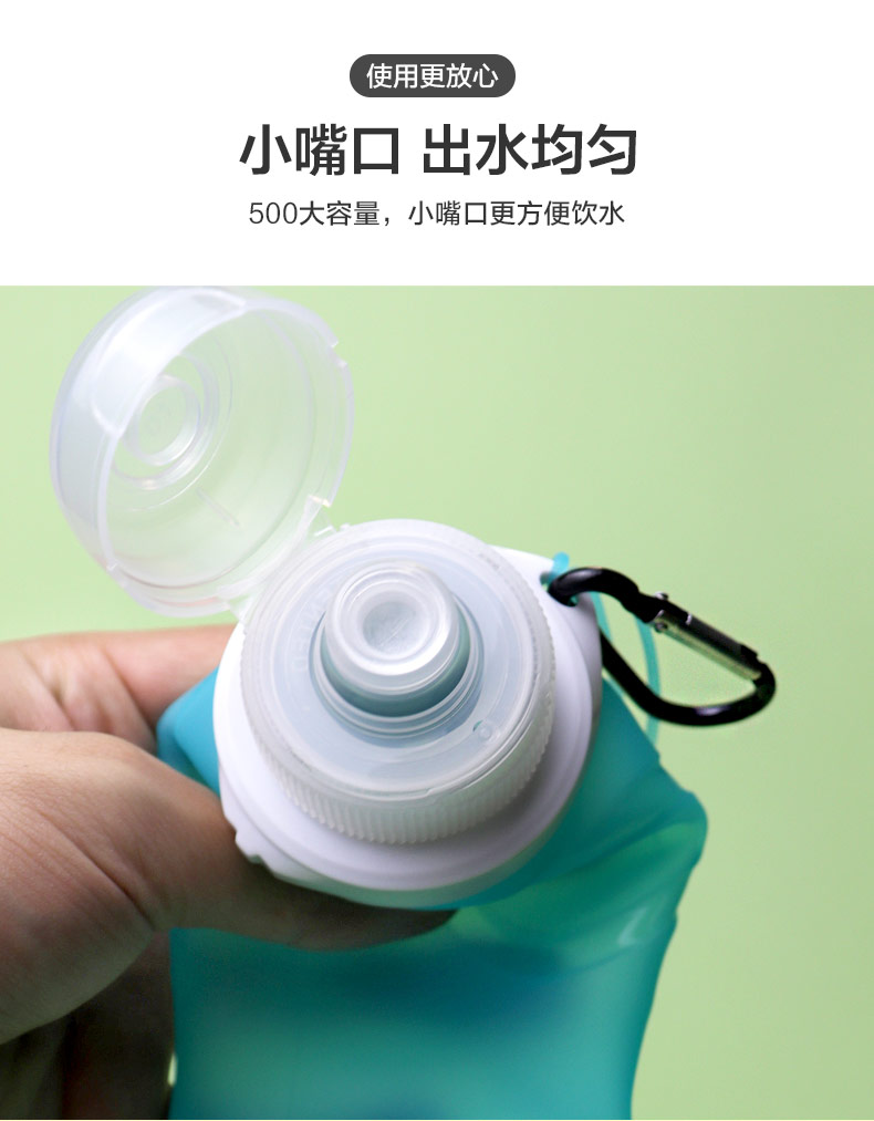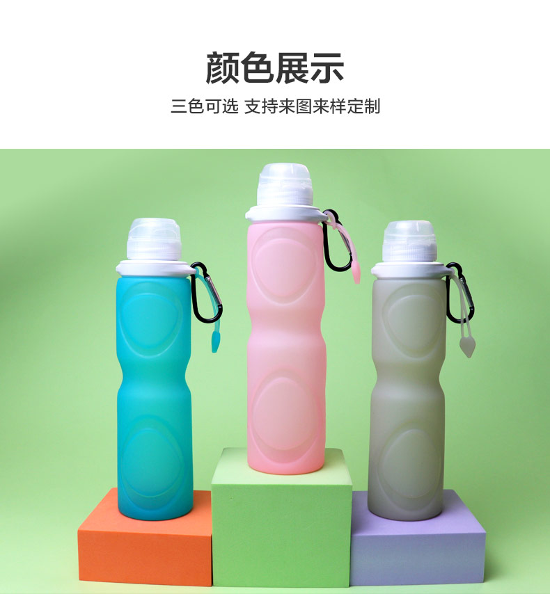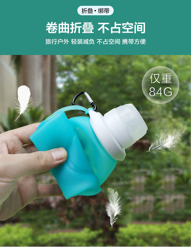 用途:瓶身柔軟,彈力好,可伸縮折疊,節(jié)省空間方便攜帶,抗摔